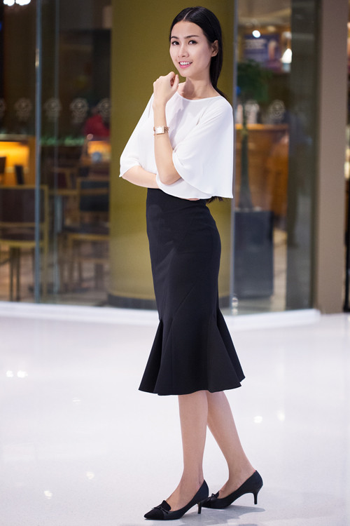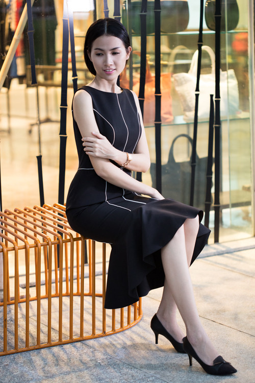Cô trẻ trung hơn khi mặc váy suông ngắn, khoe đôi chân thon dài.