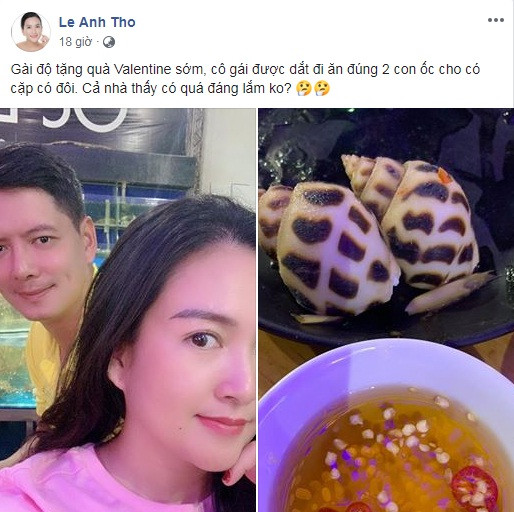 Bà xã Bình Minh hài hước chia sẻ món quà Valentine của chồng là hai con ốc hương.