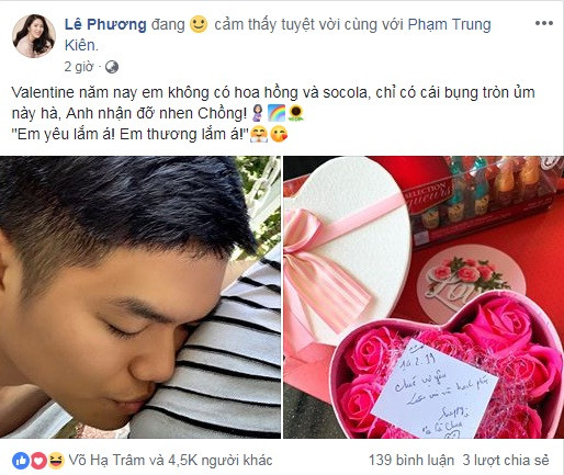 “Khi có anh bên cạnh thì với em ngày nào cũng là lễ tình nhân”- diễn viên hài Thu Trang viết.