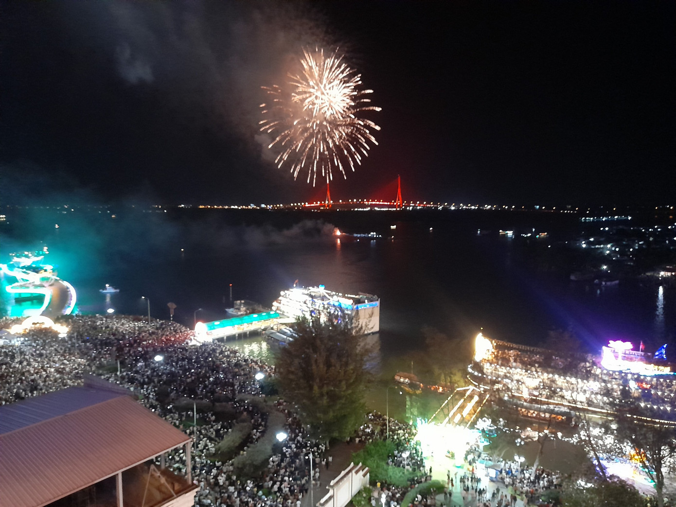 | Màn pháo hoa tầm cao diễn ra 15 phút. Đây là lần đầu tiên Cần Thơ tổ chức bắn pháo hoa từ sà lan trên sông. |