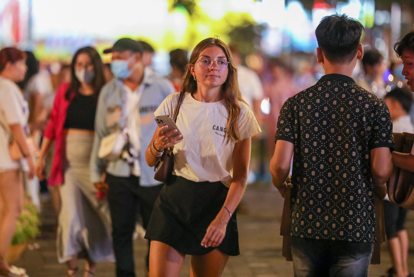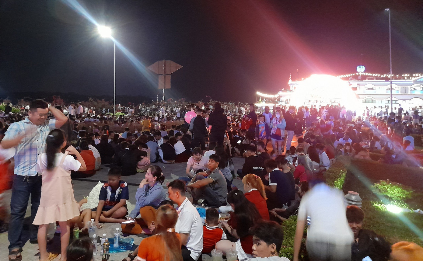 | Không khí vui đón năm mới của người dân và du khách nhộn nhịp, tấp nập khắp các tuyến đường hướng về Quảng trường như Lê Thánh Tôn, Nguyễn Thị Minh Khai, Trần Hưng Đạo. Cận thời khắc giao thừa, lượng người đổ về quảng trường càng đông, trên bờ, dưới bãi biển đều chen kín khách. |