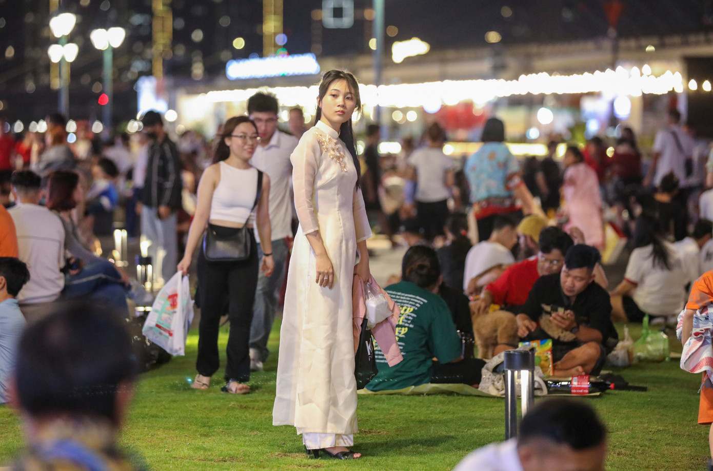 Đến hơn 22h, khu vực đường hoa Tết đã chật cứng người. Dọc hai bờ sông Hàn, người dân cũng chen chân để chờ đợi màn pháo hoa rực rỡ chào năm mới Giáp Thìn.