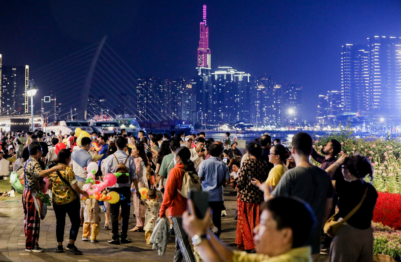 Càng đến thời khắc Giao thừa, dòng người đổ về dọc hai bên bờ sông Hàn để chờ đợi màn bắn pháo hoa. Người người chen chân ngắm linh vật rồng "phun lửa, phun nước".