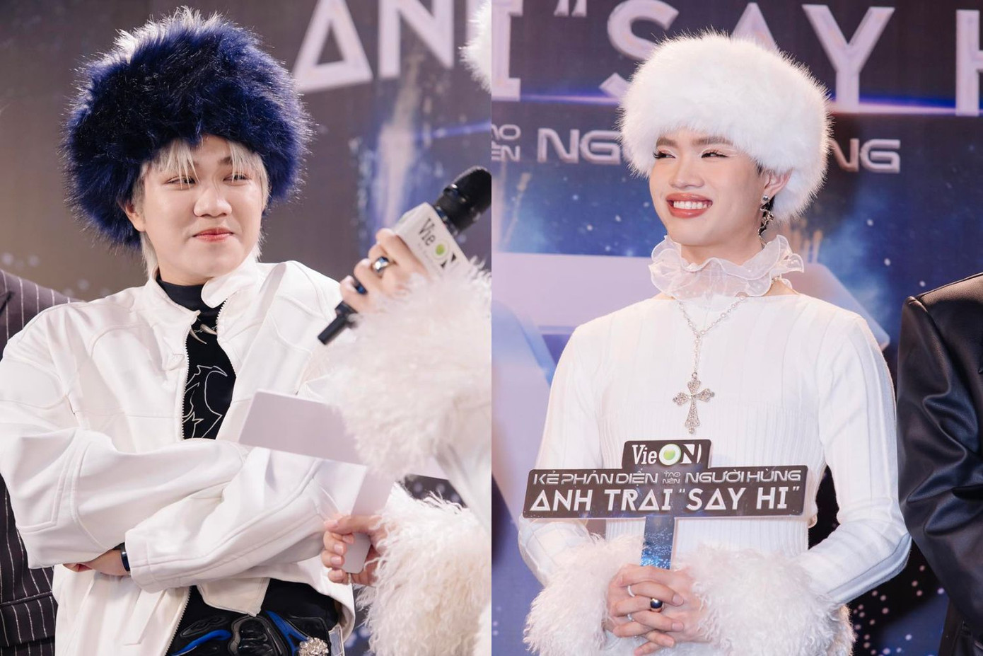 Giữa dàn "anh trai" visual sáng bừng thảm đỏ, Pháp Kiều và Captain Boy bất ngờ trở thành tâm điểm chú ý khi diện phong cách tương đồng. Cả hai đều chọn mũ lông làm điểm nhấn nhưng đối lập màu sắc trắng - đen.