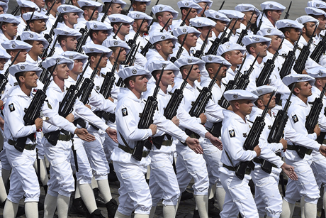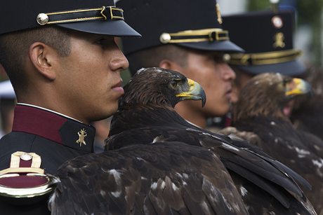 156 học viên các học viện quân sự của Mexico bao gồm Hải quân, Lục quân, Không quân và Hiến binh đã mở đầu cuộc diễu hành trên đại lộ danh tiếng Champs-Elysées. Trong ảnh là một học viên Mexico ôm biểu tượng của Mexico - đại bàng.