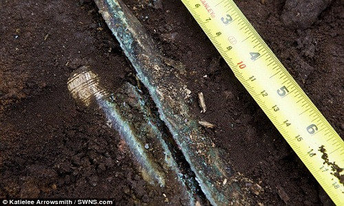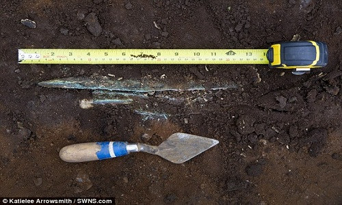 Do thanh kiếm dễ hư hỏng, nhóm khai quật buộc phải nhấc cả khối đất bao quanh lên để kiểm tra kỹ hơn trong phòng thí nghiệm. "Chúng tôi sẽ tìm hiểu nó một cách cẩn thận trong điều kiện phòng thí nghiệm. Có vẻ như nó bao gồm hai chi tiết. Đây có thể là mũi kiếm hoặc thanh kiếm gãy. Ở thời điểm này rất khó nói. Thanh kiếm là một phát hiện hiếm gặp", Alan Hunter Blair, nhà khảo cổ đứng đầu nhóm nghiên cứu, cho biết. Ảnh: SWNS.