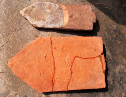 Nổi bật có hai mảnh ngói đất nung dáng uốn cong hình lòng mo dày một cm và rộng 30 cm rất hiếm hoi, vật liệu trang trí dùng để gắn trên các cung điện triều đình, xây dựng các đền tháp Chămpa...