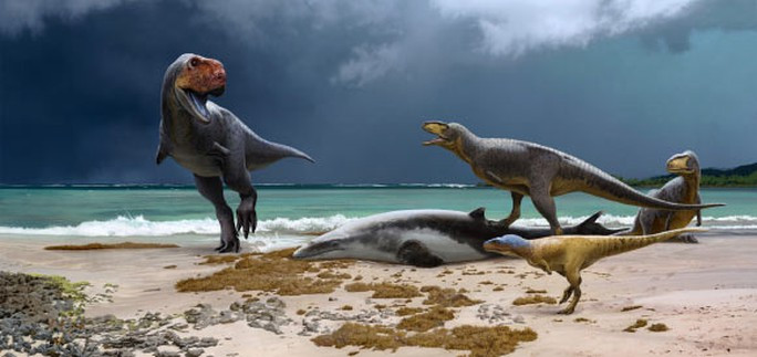 Hai loài khủng long bạo chúa bên bờ biển cổ đại - Ảnh đồ họa: Andrey Atuchin