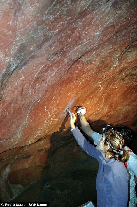 | Những nét vẽ xuất hiện trên vách đá bên trong hang động miền tây Tây Ban Nha. |