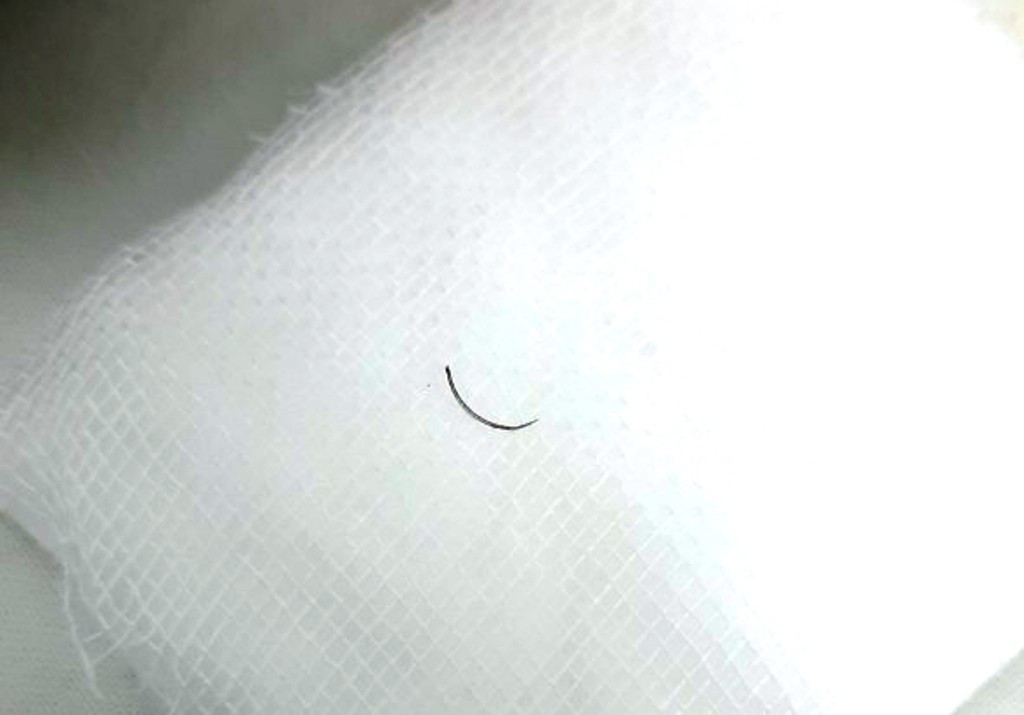 Quá trình phẫu thuật cắt lại mí, bác sĩ Bệnh viện Mắt Huế phát hiện 1 chiếc kim khâu dài hơn 1cm nằm lọt thỏm trong mí mắt, chưa nhô ra ngoài, nhưng có hiện tượng gây tổn thương đến giác mạc