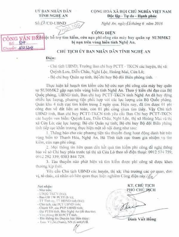 Tại trung tâm tìm kiếm cứu hộ lập tại Nghệ An, ông Đinh Viết Hồng – Phó chủ tịch UBND tỉnh Nghệ An, chủ trì lực lượng cứu hộ địa phương cho biết, UBND tỉnh Nghệ An đã ban hành công điện hoả tốc hỗ trợ tìm kiếm, cứu nạn phi công máy bay quân sự SU30MK2 bị nạn trên vùng biển Nghệ An đến với những đơn vị, địa phương liên quan.