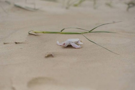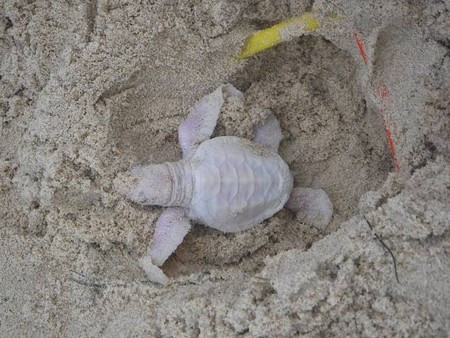 Chú rùa biển bạch tạng này được bắt gặp khi các nhân viên tình nguyện của đội chăm sóc bãi biển Castaway đang kiểm tra những quả trứng rùa biển vừa nở. Chú rùa con bạch tạng này là một trong số 122 rùa con mới được chào đời và đang tìm cách để trở về với đại dương. Rùa bạch tạng được xem là một trong những sinh vật hiếm gặp nhất trên địa cầu.