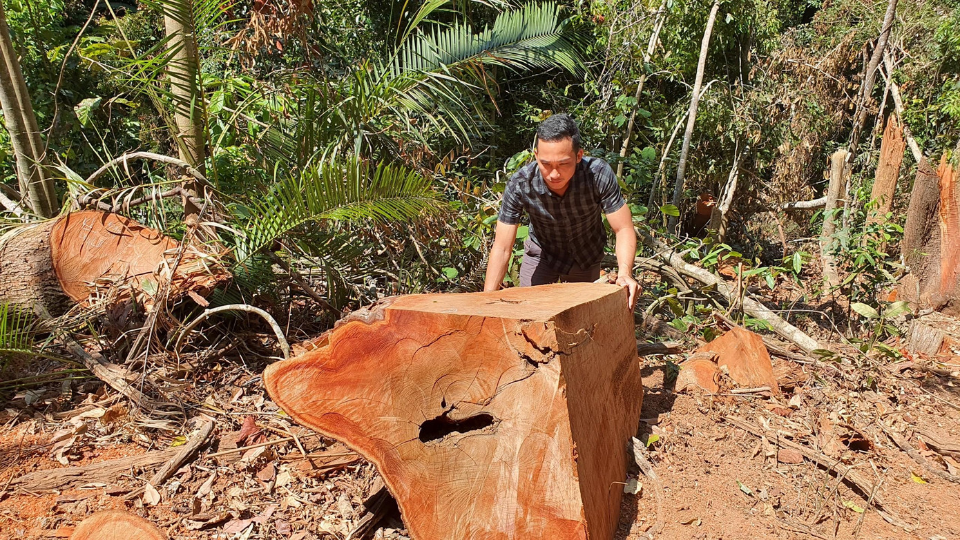 | Trong ảnh một cây gỗ hơn 2 người ôm bị lâm tặc cưa hạ. Hiện trường xung quanh tan hoang với những thân gỗ lớn nằm ngổn ngang. |