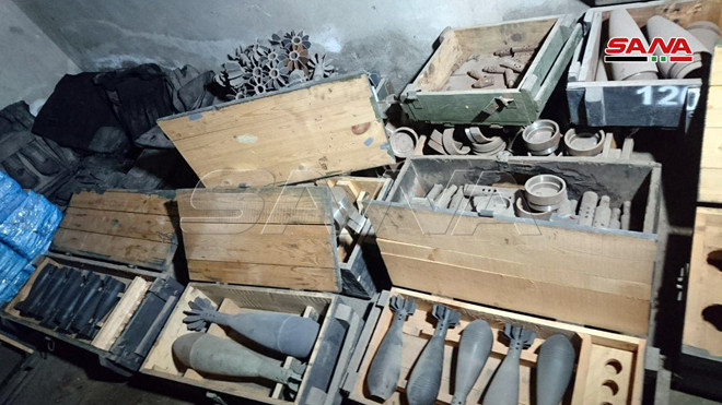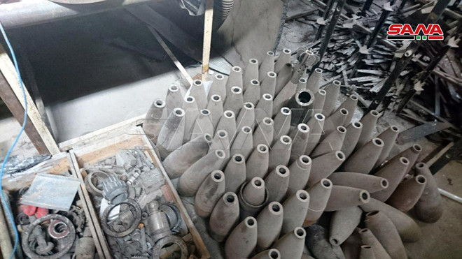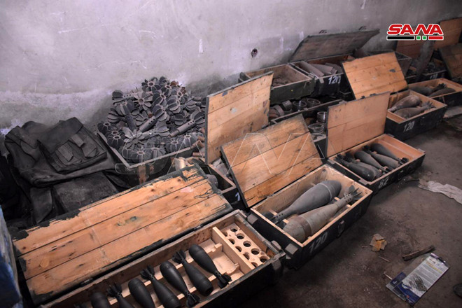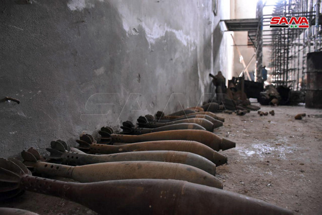 Khi khám phá các khu vực được giải phóng, quân đội Syria đã phát hiện được một xưởng sản xuất cực lớn với hàng trăm loại vũ khí quân sự khác nhau bị phiến quân bỏ lại. Ảnh: SANA