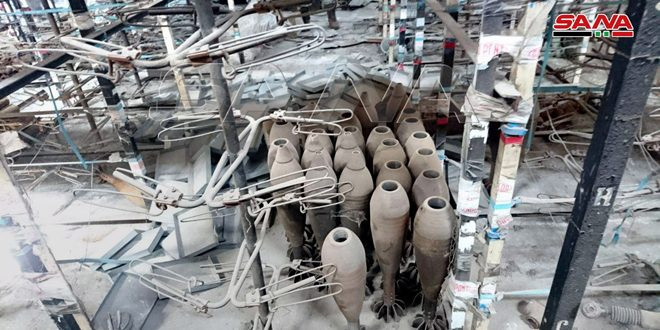 Sĩ quan của lực lượng đặc biệt của cảnh sát quân đội Syria, Viam Ahmadi cho biết: một xưởng sản xuất chỉ và may quần áo phụ nữ đã bị phiến quân trưng dụng làm nơi chứa những vũ khí tự chế này. Ảnh: SANA