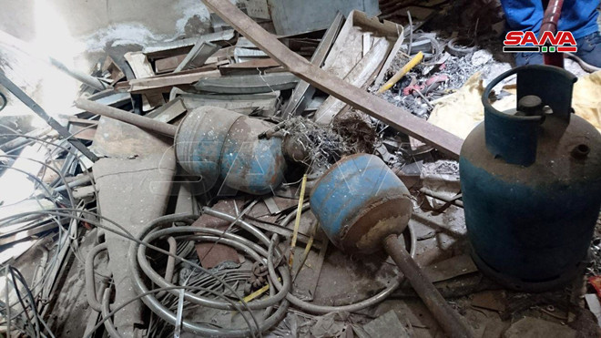 Tại đây phiến quân lưu trữ hàng trăm các loại chất nổ, bom mìn đạn dược tự chế. Ảnh: SANA
