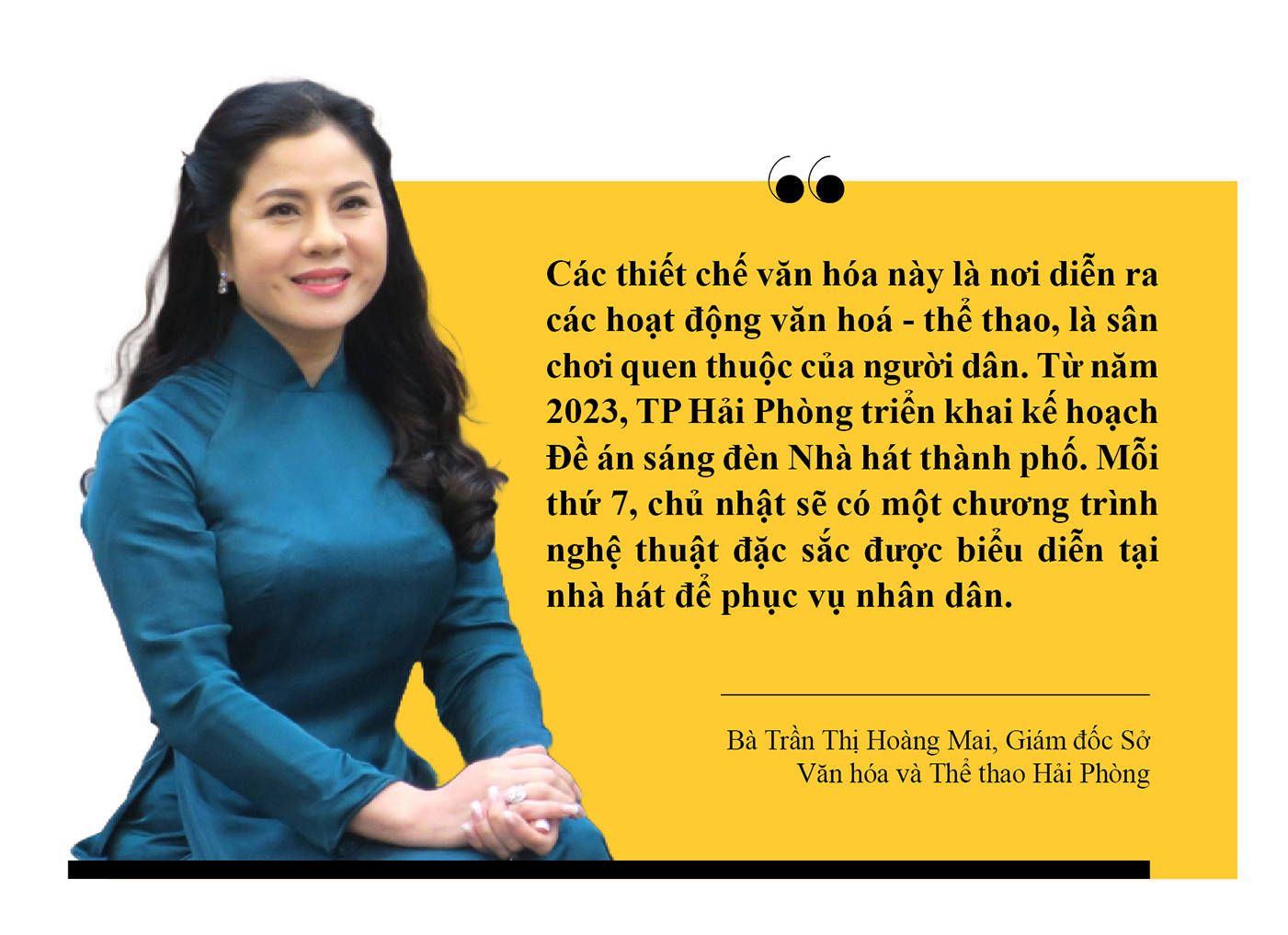 “Các thiết chế văn hóa này là nơi diễn ra các hoạt động văn hóa - thể thao, là sân chơi quen thuộc của người dân. Từ năm 2023, TP Hải Phòng triển khai kế hoạch Đề án sáng đèn Nhà hát thành phố. Mỗi thứ 7, chủ nhật sẽ có một chương trình nghệ thuật đặc sắc được biểu diễn tại nhà hát để phục vụ nhân dân”, bà Trần Thị Hoàng Mai nói.