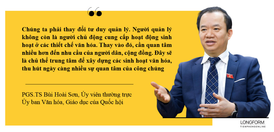 “Chúng ta phải thay đổi tư duy quản lý. Người quản lý không còn là người chủ động cung cấp hoạt động sinh hoạt ở các thiết chế văn hóa. Thay vào đó, cần quan tâm nhiều hơn đến nhu cầu của người dân, cộng đồng. Đây sẽ là chủ thể trung tâm để xây dựng các sinh hoạt văn hóa, thu hút ngày càng nhiều sự quan tâm của công chúng”, PGS.TS Bùi Hoài Sơn nêu.