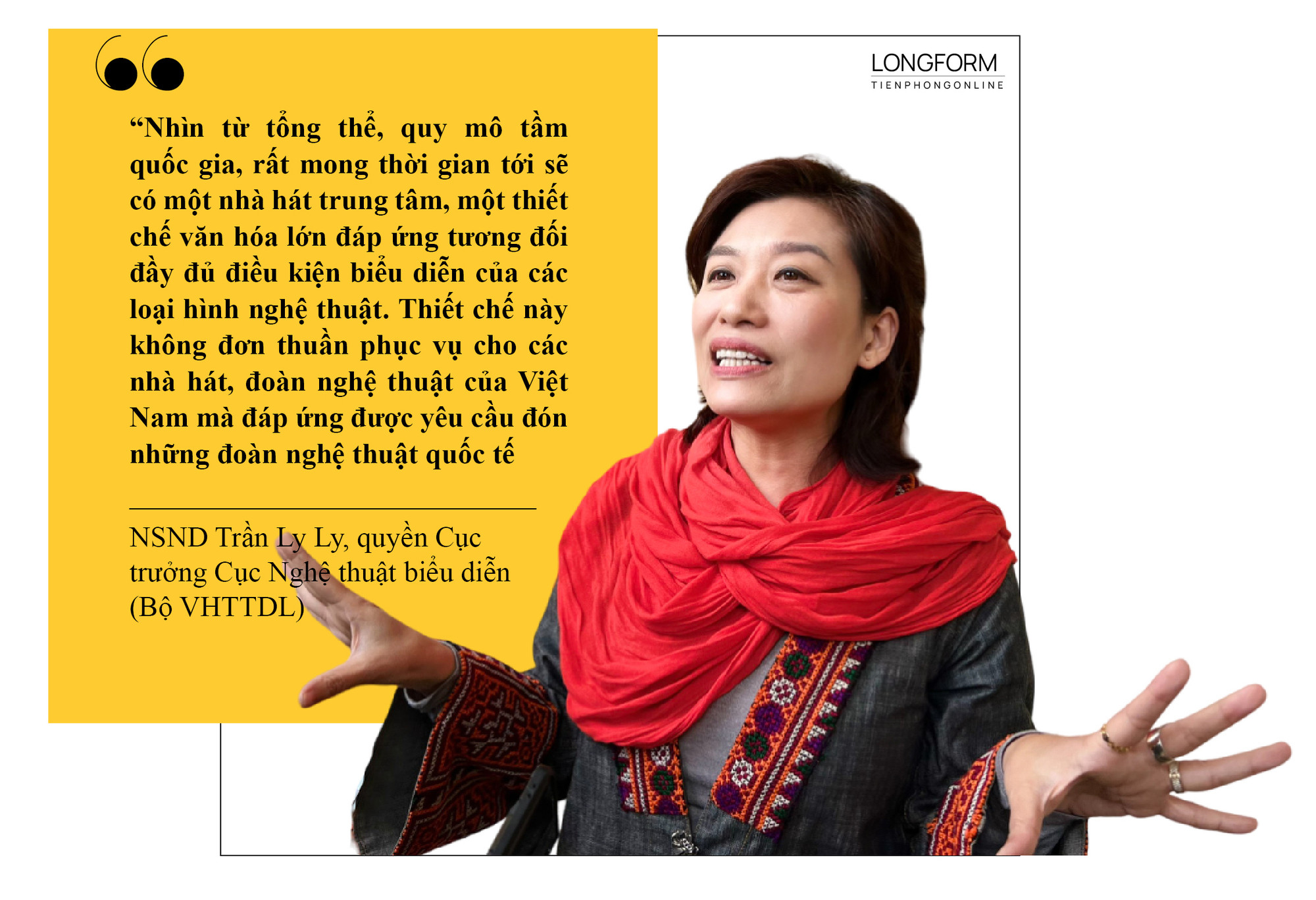 Ngoài ra, hiện nay nghệ thuật biểu diễn cả truyền thống và hiện đại đều đòi hỏi những nhà hát có cơ sở vật chất tốt, hiện đại. “Nhìn từ tổng thể, quy mô tầm quốc gia, rất mong thời gian tới sẽ có một nhà hát trung tâm, một thiết chế văn hóa lớn đáp ứng tương đối đầy đủ điều kiện biểu diễn của các loại hình nghệ thuật. Thiết chế này không đơn thuần phục vụ cho các nhà hát, đoàn nghệ thuật của Việt Nam mà đáp ứng được yêu cầu đón những đoàn nghệ thuật quốc tế”, NSND Trần Ly Ly nói.