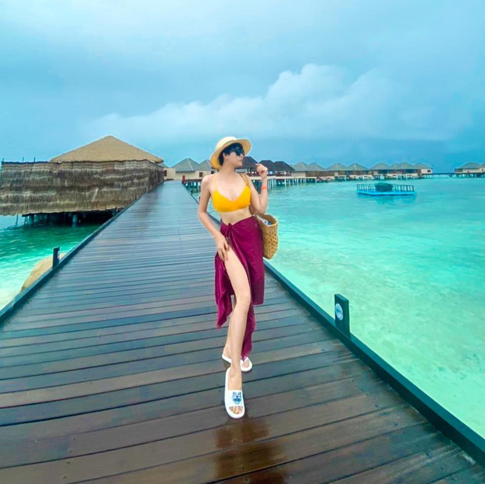 Theo đó, cựu siêu mẫu viết: "Cả nhà cứ hỏi bộ bikini này mua ở đâu? Cái này phải order trên web của Mỹ nên tôi đi xin. Tôi bận đi xây trường học, khánh thành cầu (từ thiện - pv) nên không kịp đặt trước. Tôi có hỏi Ngọc Trinh thì em ấy nói phải đặt rất lâu...
