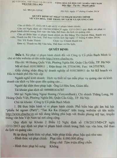 Theo đó, hai trang mạng nghe trực tuyến Chacha và NhacVui mỗi trang bị xử phạt 8 triệu đồng do phổ biến bản ghi âm bài hát Phiếu bé ngoan, Tan Ka Ka (Ganja) có nội dung không phù hợp với thuần phong mỹ tục, truyền thống văn hóa của Việt Nam tại nơi công cộng.