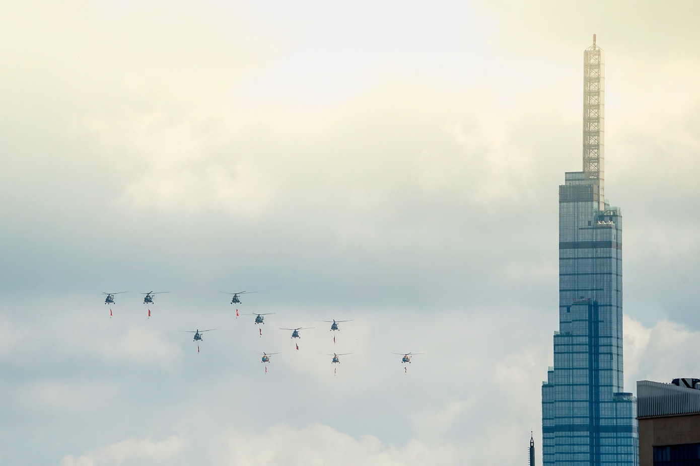 Khoảng 7 giờ 40 phút sáng, tại sân bay Biên Hòa (Đồng Nai), 10 chiếc trực thăng trong đội hình được chuẩn bị kỹ lưỡng đã đồng loạt cất cánh. Dẫn đầu là ba trực thăng mang theo hai lá cờ lớn – cờ đỏ sao vàng và cờ búa liềm đỏ thắm – biểu tượng cho tinh thần đại đoàn kết dân tộc, sự lãnh đạo sáng suốt của Đảng Cộng sản Việt Nam và niềm tự hào Tổ quốc.