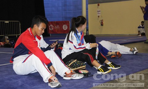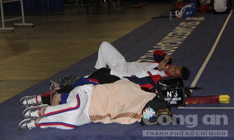 Nhưng khi ánh đèn sàn đấu tắt đi, tấm màn nhung khép lại chính là quãng thời gian dành cho những nỗi niềm của các vận động viên. Chúng tôi tìm đến sàn tập sau tấm màn che sàn đấu – đó là một nơi không gian tương đối rộng nhưng chẳng có chỗ nghỉ ngơi. Tất cả các vận động viên của các đoàn đều tự do đi lại mà không bị giới hạn khu vực.