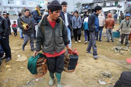Chợ phiên Bắc Hà (huyện Bắc Hà, Lào Cai) họp vào các ngày chủ nhật. Từ sáng sớm, nhiều người đàn ông trong vùng kéo về đây đem theo những lồng chim phủ vải.