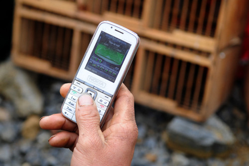 Người đàn ông dân tộc dùng điện thoại phát tiếng chim hót để nhử lũ chim họa mi..