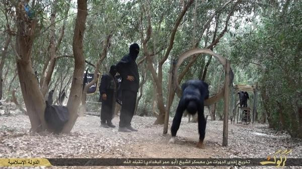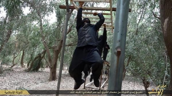 Màn đu người rèn luyện sức khỏe cho các tay súng Hồi giáo. Phần lớn chiến binh mới chiêu mộ của IS, đặc biệt các phần tử nước ngoài, bị đẩy ra chiến trận hoặc tham gia những vụ đánh bom liều chết. Ảnh: Long War Journal.