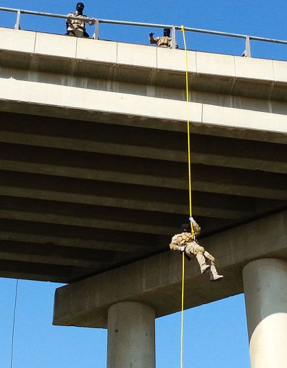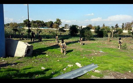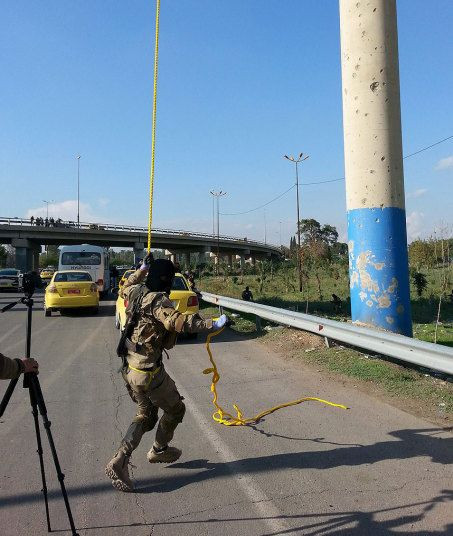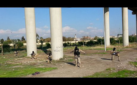 Các thành viên của IS vẫn tiến hành huấn luyện mạo hiểm trên cây cầu bất chấp các phương tiện đang lưu thông. Chúng đeo mũ trùm kín mặt và mang súng trường tấn công nhưng không bị phản đối vì các hành vi khủng bố tàn bạo của chúng trong khu vực.