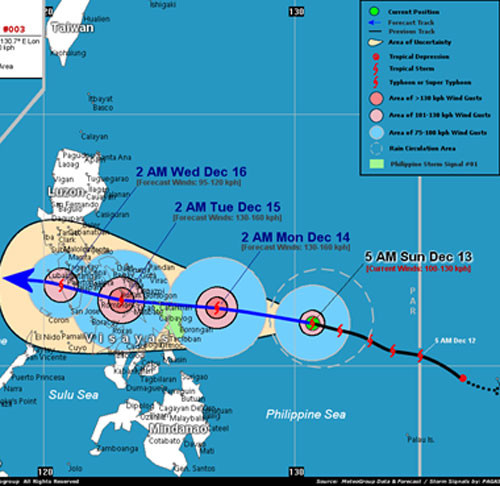 Dự báo trong 24 giờ tới, bão di chuyển chủ yếu theo hướng Tây, mỗi giờ đi được khoảng 15-20km. Đến 07 giờ ngày 15/12, vị trí tâm bão ở vào khoảng 12,9 độ Vĩ Bắc; 121,8 độ Kinh Đông, trên khu vực miền Trung Philippines. Sức gió mạnh nhất ở vùng gần tâm bão mạnh cấp 13 (tức là từ 135 đến 150km một giờ), giật cấp 15-16.
