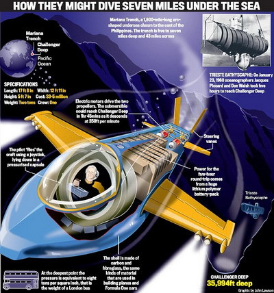 “Phù thủ Hollywood” James Cameron sẽ đưa chiếc tầm ngầm công nghệ cao xuống độ sâu 10,9 km( điểm sâu nhất của vực Mariana là 13,6 km) để thực hiện những cảnh quay 3D trong phần hai và phần ba của “siêu bom tấn” Avatar.