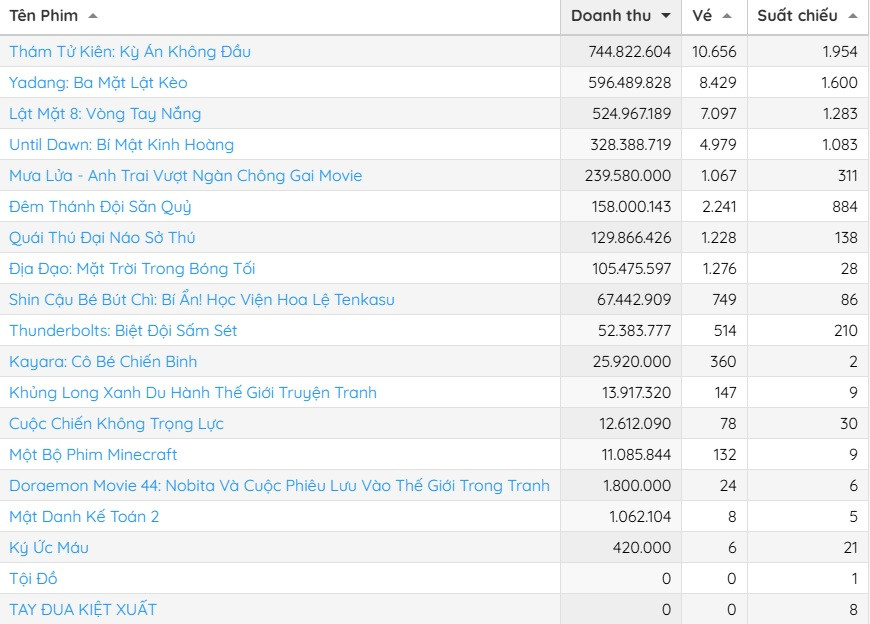 Chưa kể các tập Doraemon luôn phát hành vào thời điểm cuối tháng 5, khi học sinh bắt đầu nghỉ Hè nên càng tiện ra rạp xem phim. Chính vì thế mà Doraemon: Nobita và Cuộc Phiêu Lưu Vào Thế Giới Trong Tranh vừa mới chiếu hai ngày đã thu về 27 tỷ đồng, nhiều hơn tổng doanh thu của tất cả các phim còn lại. Tập phim thứ 44 về mèo máy và các bạn còn được khen là kịch bản ấn tượng hơn nhiều phần phim trước đó nên càng thu hút khán giả.