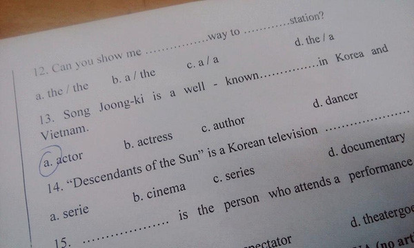 Còn tại câu 14 có đề cập: "“Descendants of the Sun” is a Korean television…" tạm dịch là: "Hậu duệ mặt trời là... một truyền hình Hàn Quốc". Các đáp án để lựa chọn gồm series, serie, cinema, documentary.