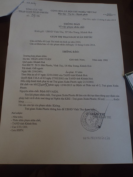 Theo giấy tờ thu thập được, sau khi phạm nhân Tuấn chết, trại giam đã gửi giấy thông báo cho UBND phường Vĩnh Thọ, đồng thời cũng gửi cho gia đình phạm nhân, cùng một số cơ quan liên quan.