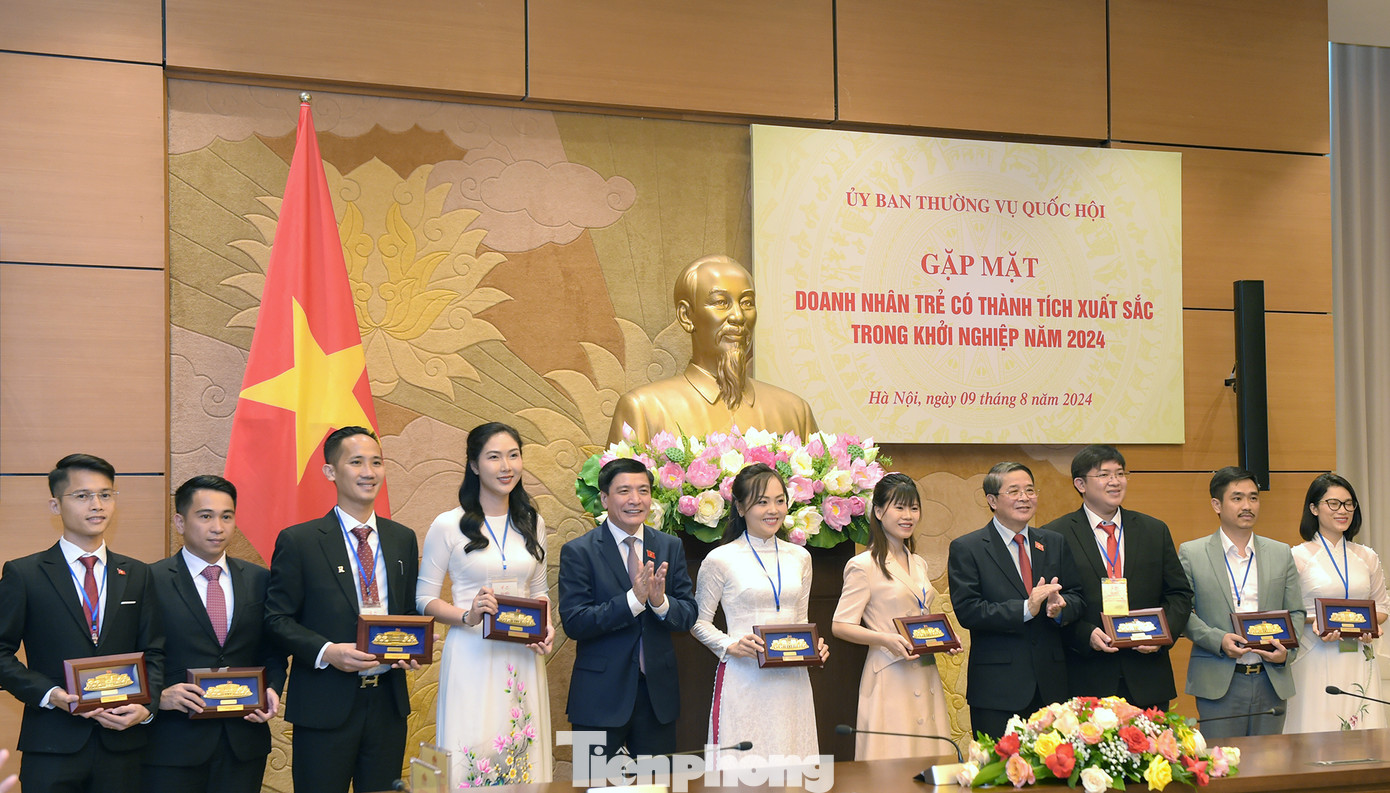 | Phó Chủ tịch Quốc hội tặng quà Top 10 Doanh nhân trẻ khởi nghiệp xuất sắc 2024 tại buổi gặp mặt. Ảnh: Xuân Tùng |