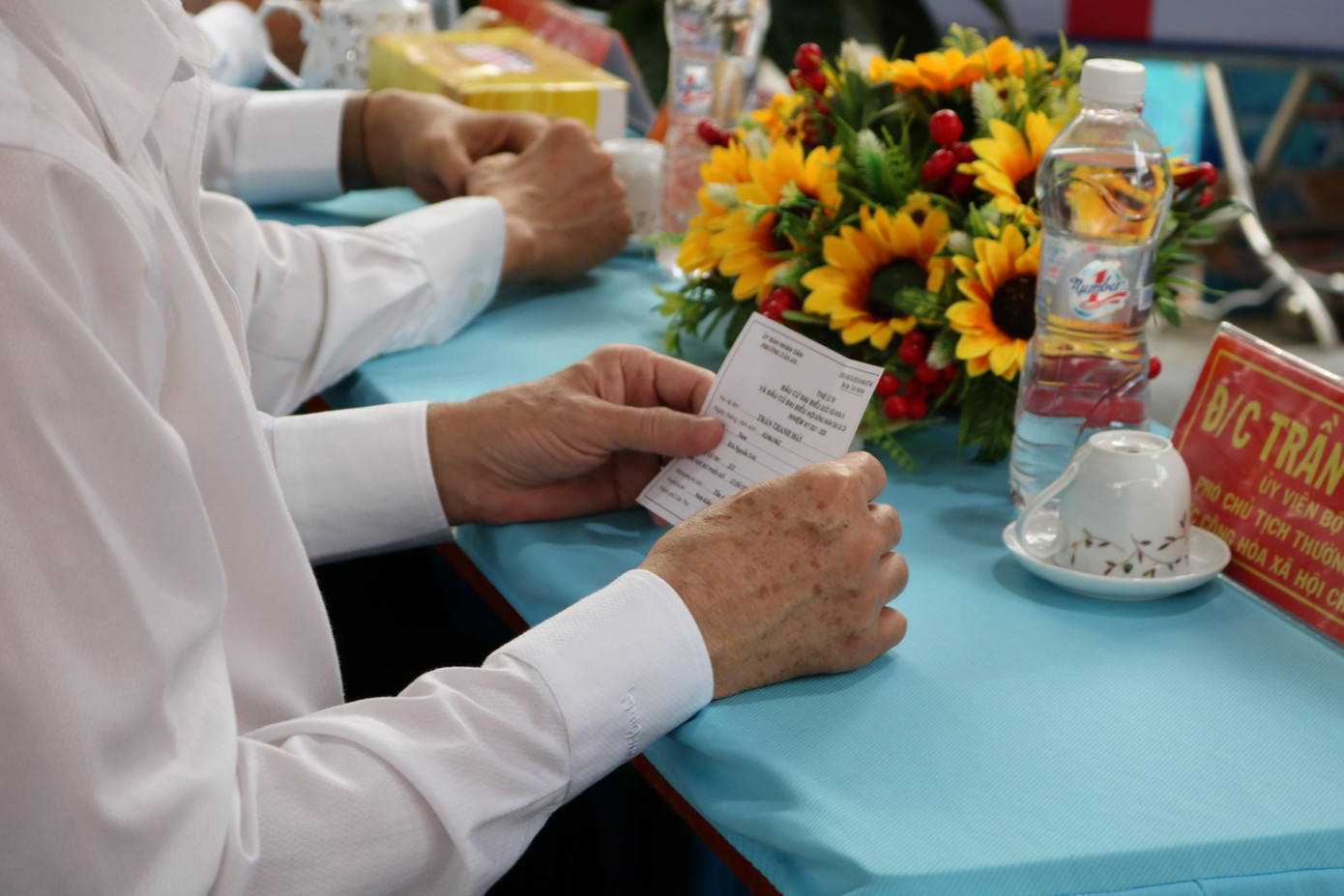 | Ông Trần Thanh Mẫn đưa thẻ cử tri và nhận phiếu bầu cử - Ảnh: Kim Hà. |