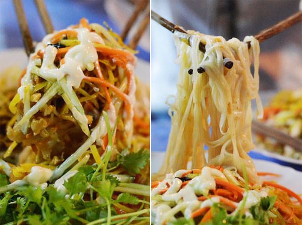 Khi trộn đều, thực khách sẽ thấy quyện với lớp nước sốt nâu sậm như đường mật là từng thớ bánh phở trắng mềm mại cùng những thành phần hấp dẫn mời gọi. Bánh phở thơm mềm quyện cùng thịt xá xíu tẩm gia vị vừa đủ độ, vị bùi bùi của lạc, màu vàng óng, vị thơm thơm giòn giòn của khoai lang chiên khiến món ăn càng dễ "vào".