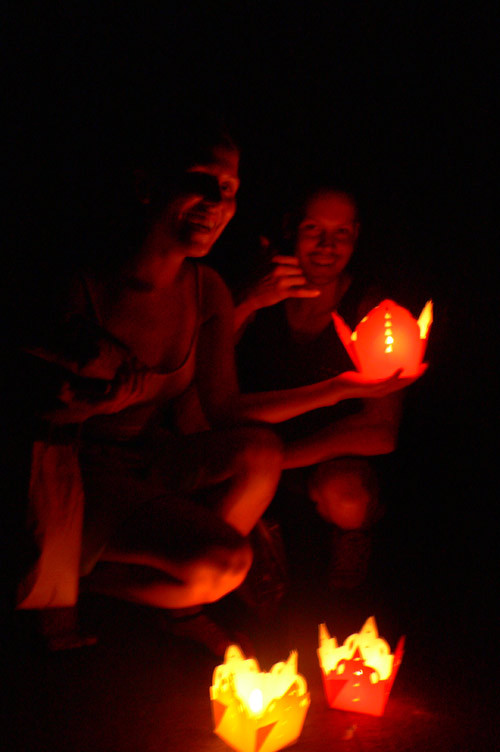 Du khách cùng thắp đèn hoa đăng