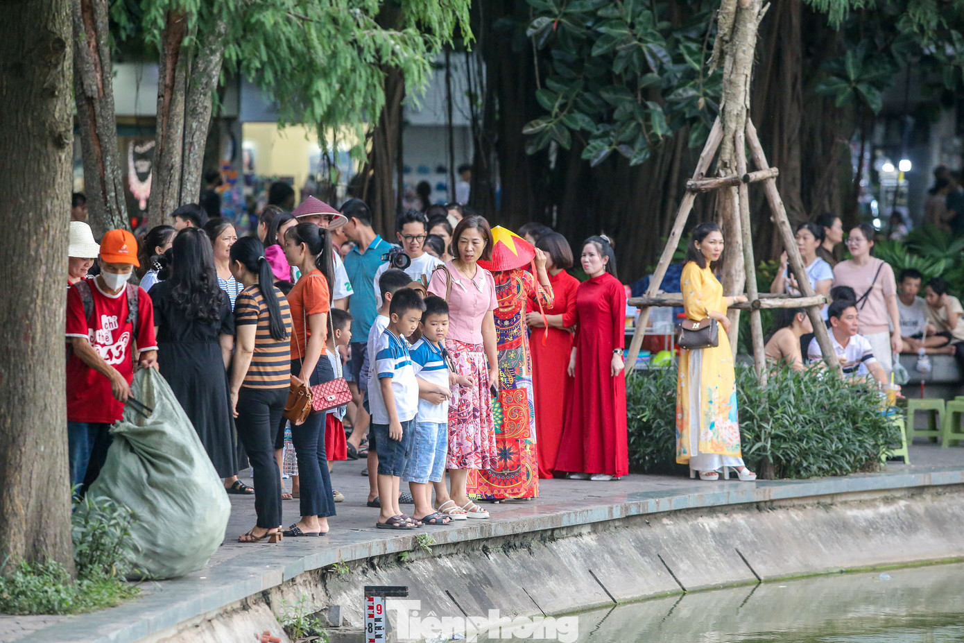 | Khu vực bờ kè nhìn thẳng ra tháp Rùa thu hút nhiều người đến chụp ảnh. |
