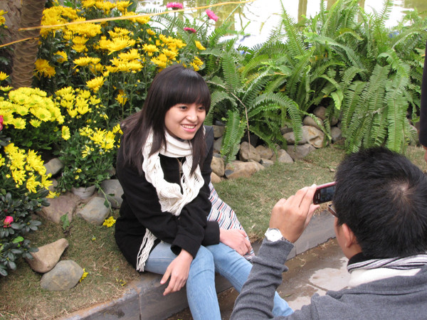 | Một gia đình chụp ảnh lưu niệm bên vườn hoa. |
