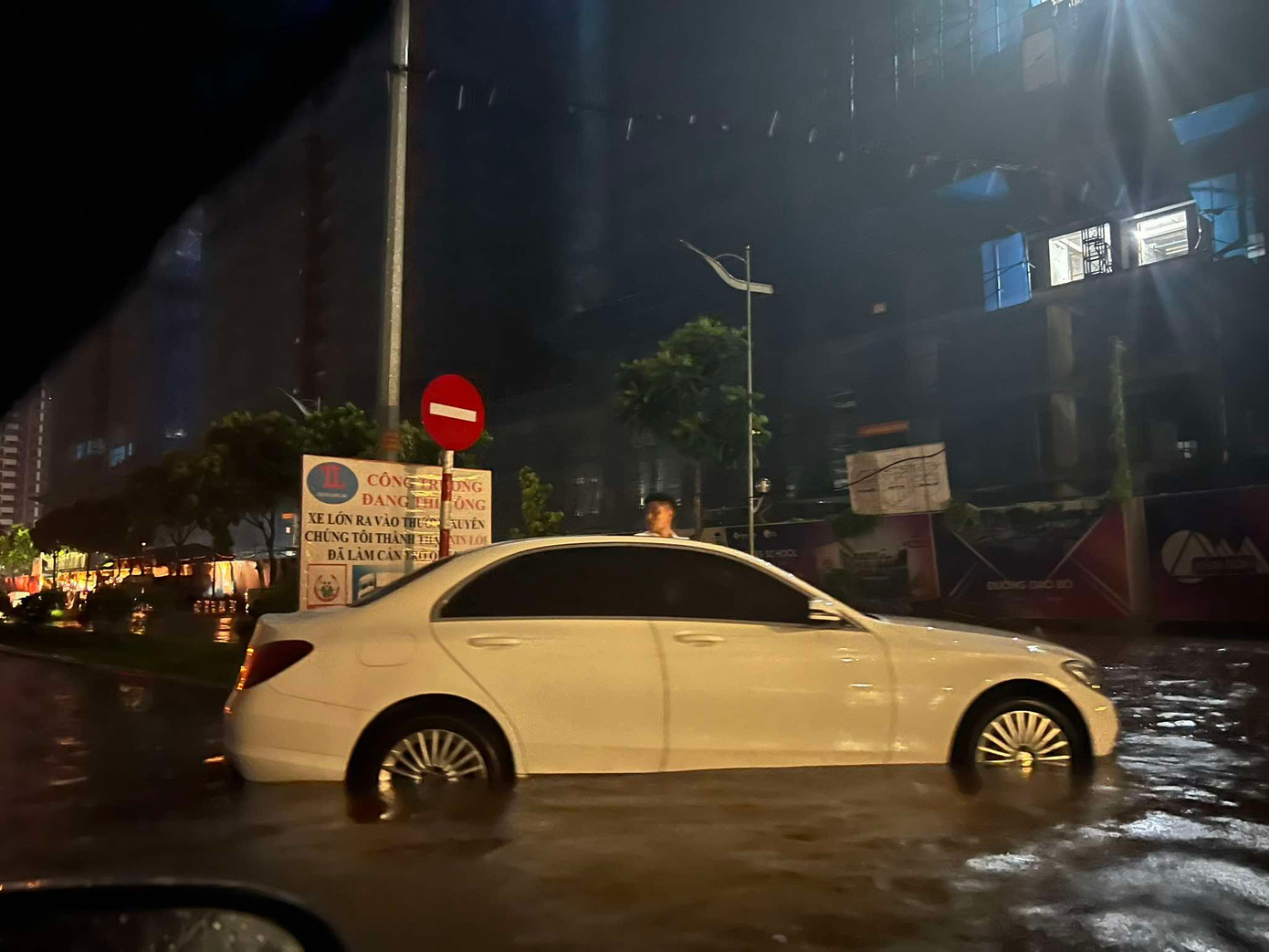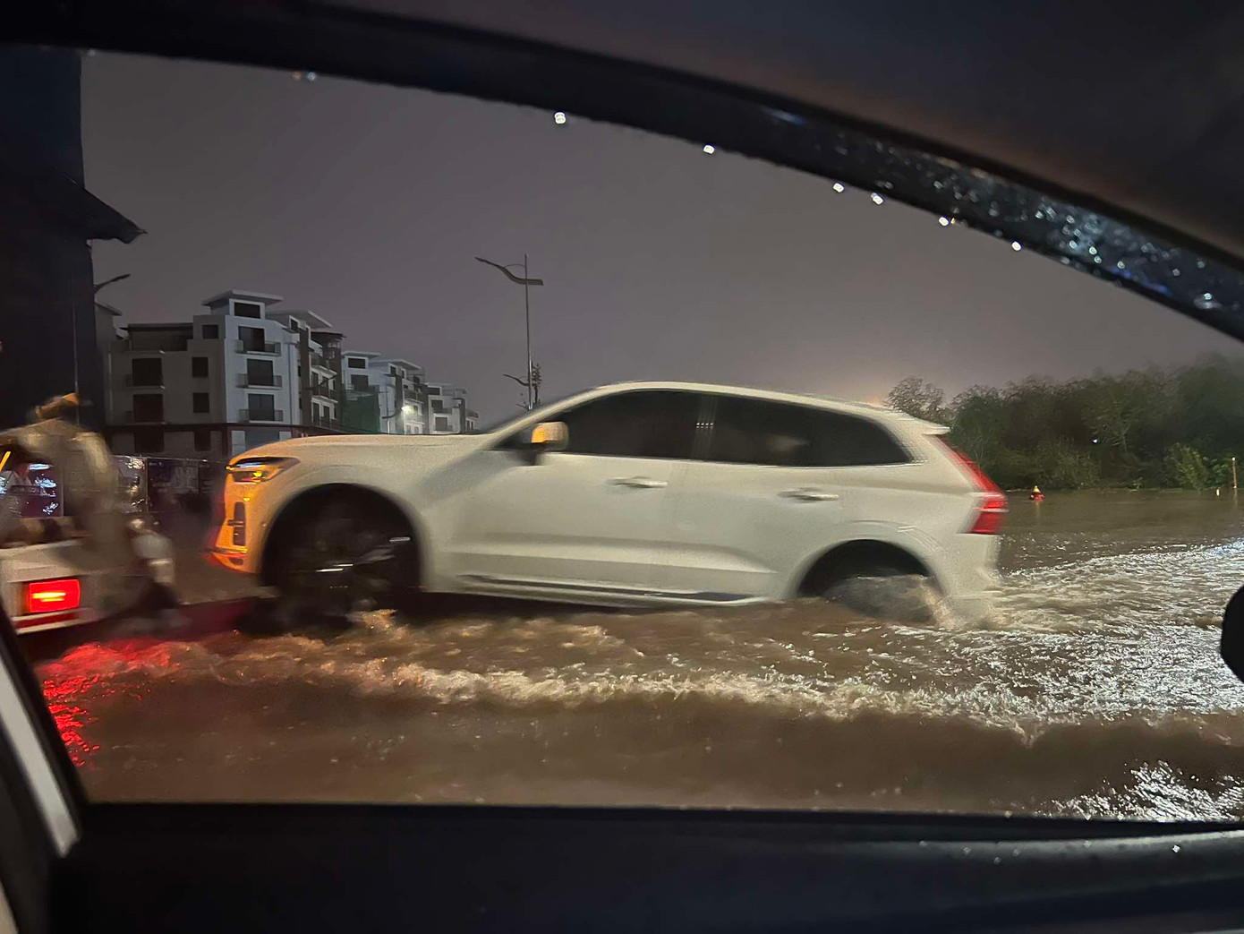 | Không chỉ xe máy, ô tô cố gắng vượt qua nút giao, chết máy ngay giữa biển nước. |
