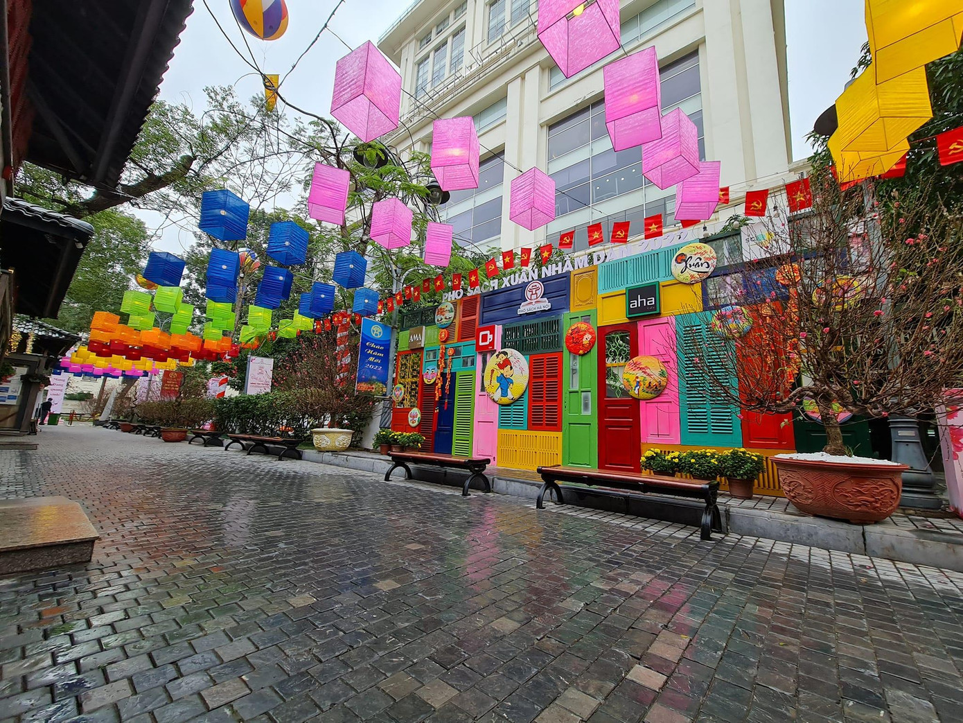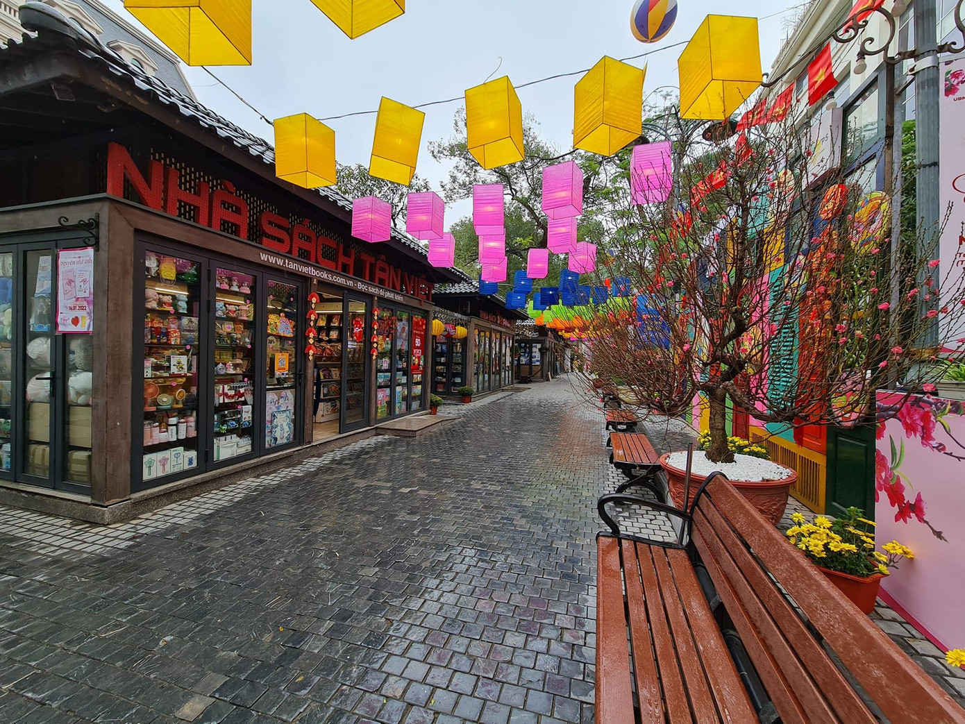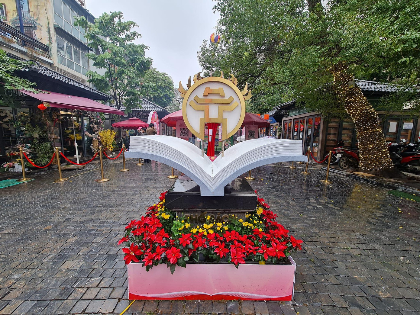 | Cổng vào Phố sách được trang trí rực rỡ với 2 màu sắc chủ đạo là đỏ và vàng |