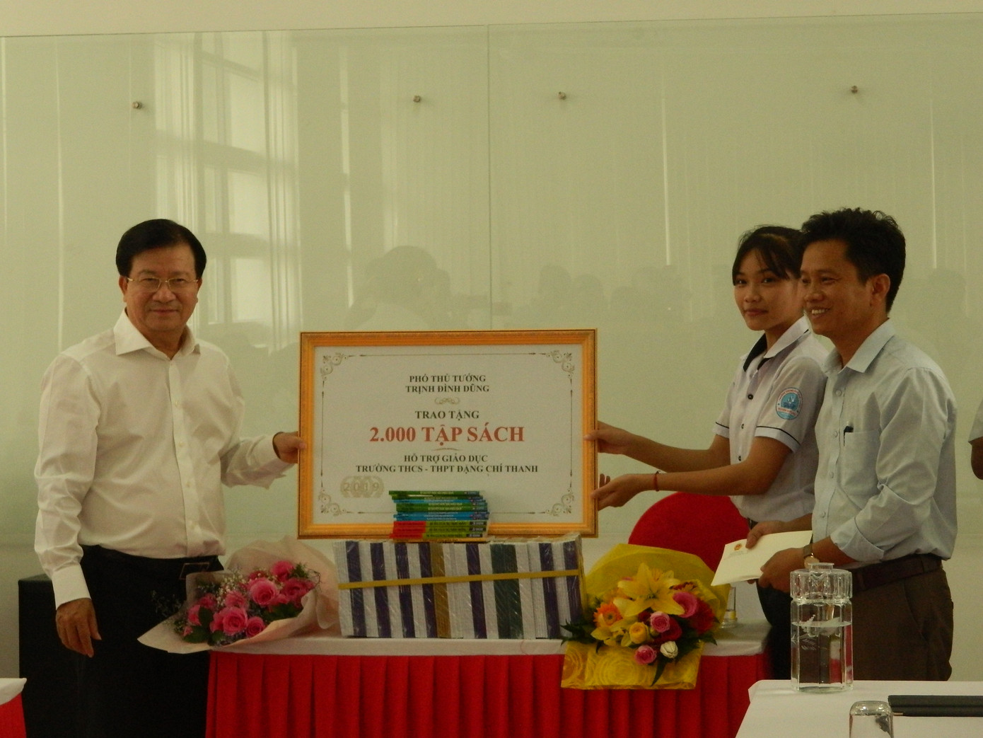 Nhân dịp này, thay măt đoàn công tác của Chính phủ, Phó Thủ tướng Trịnh Đình Dũng đã trao tặng 2.000 tập sách để phục vụ công tác giảng dạy và học tập của thầy trò trường THCS - THPT Đặng Chí Thanh.