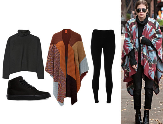 Nếu áo cổ lọ vẫn chưa đủ ấm mà phần cổ lại khá to và dày, không thể quấn thêm khăn, bạn hãy khoác thêm một chiếc áo choàng poncho hay áo cape, đi cùng quần skinny hay legging.