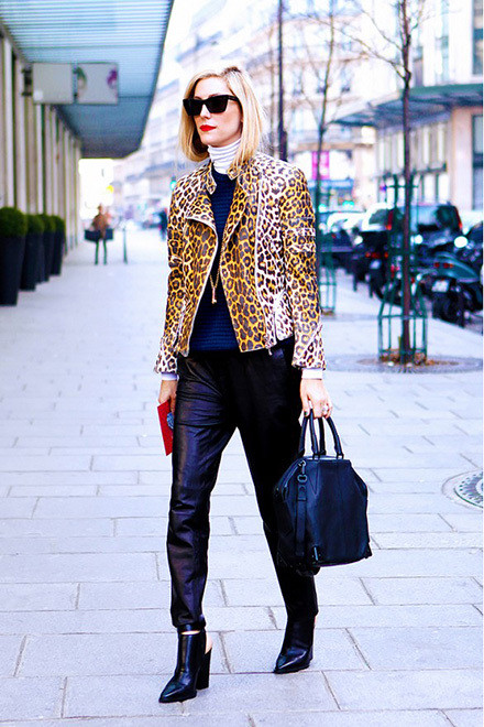 Áo khoác da báo sẽ là lựa chọn tối ưu, đủ để bạn gây chú ý trên đường phố. Không nên dùng áo khoác lông, bởi nó sẽ khiến các lớp áo bị dày lên.