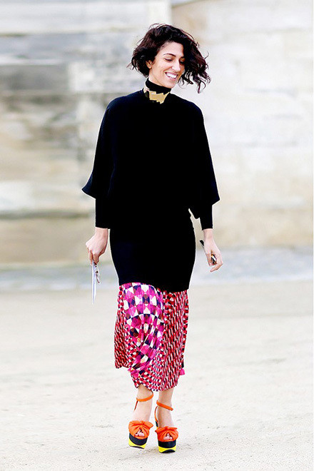 Hiện đại hơn, bạn có thể chọn áo dáng dài, trơn màu, mix cùng chân váy họa tiết bắt mắt, vòng cổ kim loại.