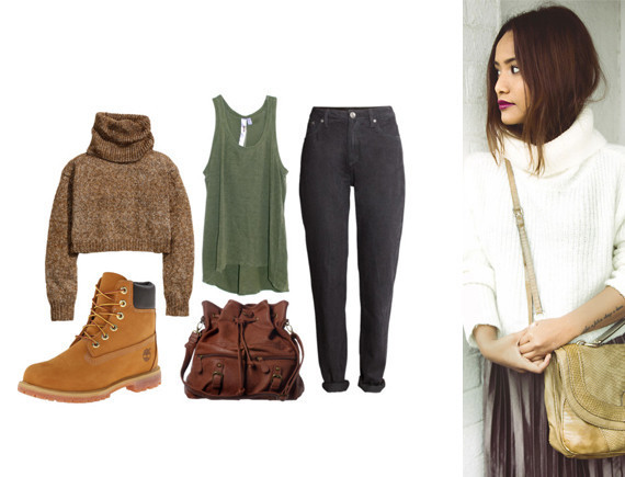 Những tín đồ thời trang sở hữu mái tóc dài có thể tạo kiểu tóc bob giả với loại áo cổ lọ chất liệu dày, phần cổ rộng và cao. Trái ngược với phần thân trên dày dặn và thùng thình, nên chọn quần jeans ôm và boots da để tăng thêm vẻ gọn gàng và năng động.