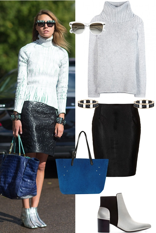 Set đồ hiện đại gồm áo len cao cổ gam trung tính, chân váy bút chì, bốt màu bạc, túi xanh đậm sẽ khiến các cô gái thời thượng và cá tính.